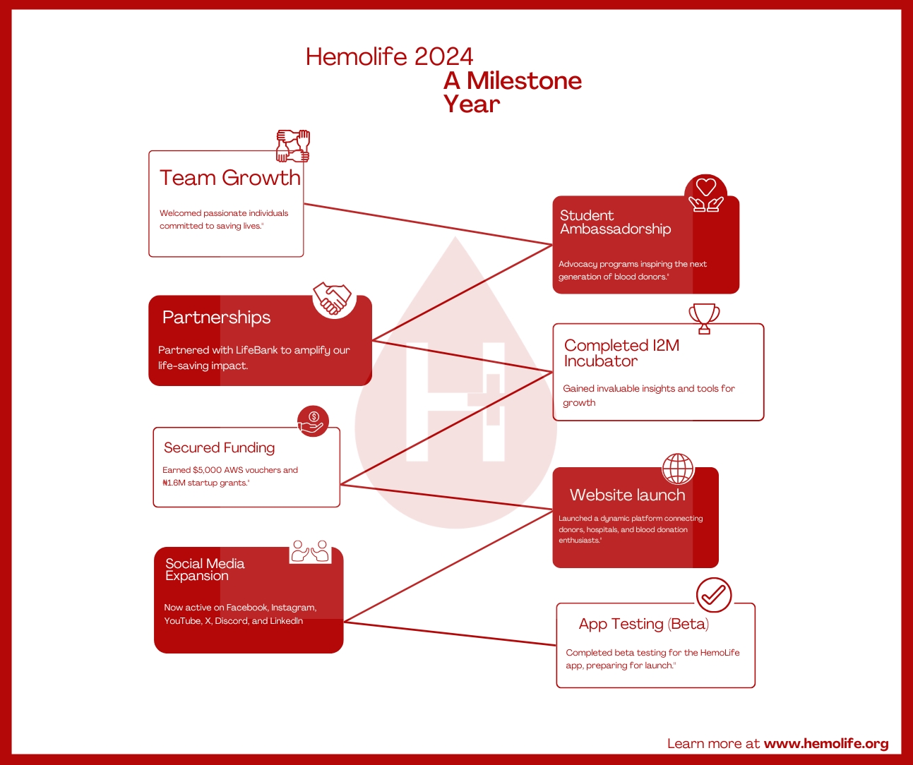 As 2024 draws to a close, we at HemoLife reflect on an extraordinary year of growth, impact, and progress. From launching our website to forging meaningful partnerships, the journey has been nothing short of inspiring. Here’s a recap of what we’ve achieved together: 1. Website Launch This year marked the unveiling of the official HemoLife website — a dynamic platform connecting donors, hospitals, and blood donation advocates. The website serves as a hub for information, resources, and tools supporting our mission to revolutionize blood donation in Nigeria and beyond. Visit us at www.hemolife.org. 2. Social Media Channels Launch We expanded our digital presence by launching active social media channels, essential for engaging our growing community, sharing inspiring stories, and raising awareness about blood donation. Connect with us on:Facebook | Instagram | YouTube | X | Discord | LinkedIn 3. Team Expansion Our HemoLife family grew significantly this year. We welcomed passionate individuals from diverse backgrounds who brought fresh ideas, skills, and energy to our mission. Together, we’re building a team committed to saving lives and creating lasting change. We’re always looking for individuals ready to contribute. If you’re interested, reach out to our founder at emmanuel@hemolife.org. 4. Strategic Partnerships In 2024, we proudly partnered with LifeBank, a leader in blood, oxygen, and medical consumables distribution in Nigeria. Additionally, we established relationships with the National Blood Service Commission (NBSC), Coalition of Blood for Africa (COBA), Project Innovation to Market, and the University of Lagos. These partnerships are pivotal as we gear up for 2025. 5. Project Innovation to Market (I2M) Incubator We were selected for and completed the prestigious Project I2M incubator program. This 10-week journey equipped us with invaluable tools and insights to propel our vision forward. Through this program, we secured critical funding and resources: These resources, alongside industry linkages, company registration, and trademark support, are helping us build the infrastructure to scale our operations. 6. Alpha Testing One of our proudest achievements was completing the alpha testing phase of the HemoLife app. This milestone brings us closer to launching a user-friendly, tech-driven platform that connects blood donors with recipients. Thanks to your feedback, we’re refining the app for its official launch in Q1 2025. 7. Ambassadorship Program We launched the HemoLife Student Ambassador Program, empowering young leaders to advocate for blood donation and spread awareness in their communities. Their dedication has been instrumental in driving our mission forward. We welcome partnerships with individuals and organizations ready to champion this cause. Looking Ahead: HemoLife’s Vision for 2025 1. Official App Launch Our much-anticipated app will go live in Q1 2025. With recent collaborations, insights from the I2M program, and successful alpha testing, we’re ensuring a seamless and glitch-free experience from day one. 2. Expansion In 2025, we aim to: 3. Feature Updates We plan to integrate advanced features, including AI, IoT, and blockchain capabilities. This will enable real-time tracking of each pint of blood donated and further enhance user experience. Furthermore, other integrations would ensure that user feedback is incuded as an ongoing process. 4. User Acquisition Campaigns We will launch focused strategies to drive app downloads, grow our donor community, and host blood drives. Active participants will be rewarded, creating a loyal and engaged user base. 5. Strategic Partnerships We’re committed to forging new alliances with health organizations, hospitals, and community groups. Over 20 potential partners have already been identified to help amplify our impact. Join Us in 2025 We’re deeply grateful for your support in 2024 and excited about the opportunities ahead. Together, we’ll tackle challenges, embrace innovation, and create a future where access to safe blood is no longer an issue. Let’s take flight into a transformative 2025 with HemoLife, the first AI-driven blood donation app simplifying access to life-saving resources. Join us — because every pint counts.